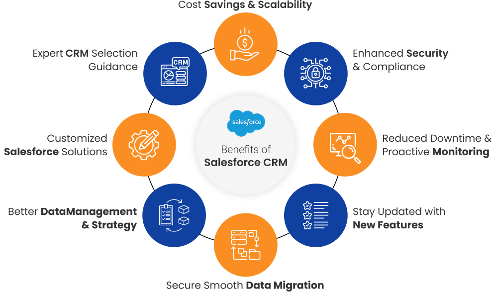 Salesforce CRM offers a wide range of benefits that help businesses streamline operations and drive growth. It enables cost savings and scalability, provides expert CRM selection guidance, and ensures enhanced security and compliance. By implementing Salesforce, organizations can reduce downtime with proactive monitoring, stay updated with the latest features, and enjoy secure and smooth data migration.